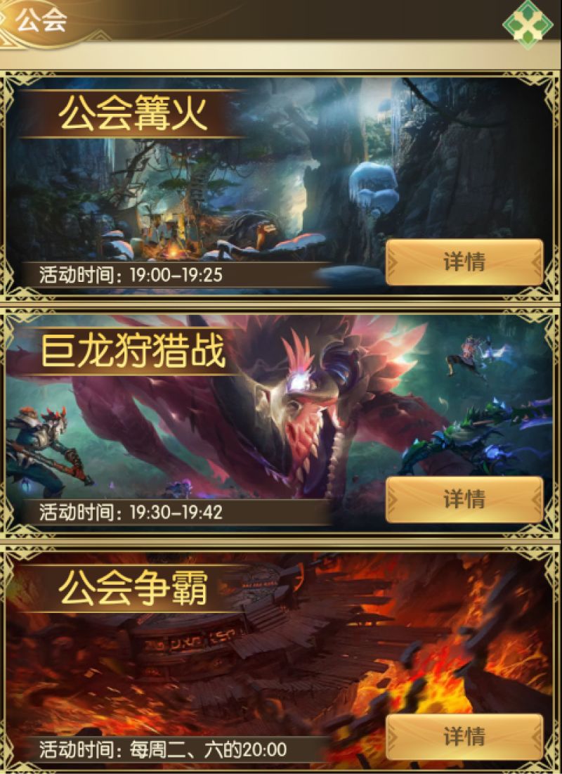 加入公会后,还会开启各种公会活动,如增加经验的篝火,还有击败巨龙后开启的拍卖以及公会争霸,都有着丰富的奖励。