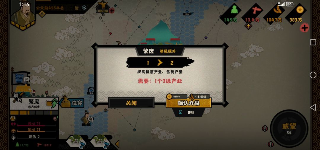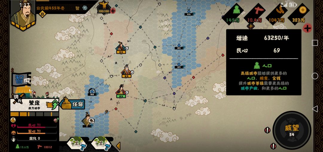 2.点击晁错循环政策,增加4w人口(智开局8座城,每城5000,符合数据)