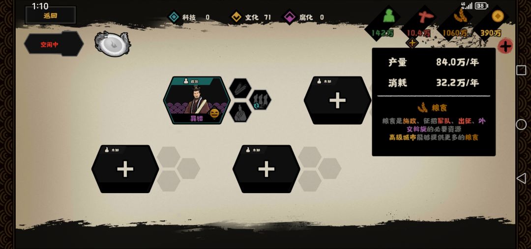 1.开局我选择三家分晋的智,可以看到初始人口为142万,粮食产量为84
