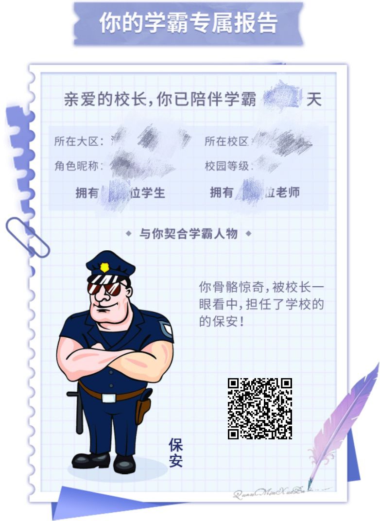 1.通过分享学霸专属报告给好友,好友通过分享页面二维码下载游戏并创角达到10级后即可视为成功邀请到一名新校长(未下载过全民学霸)