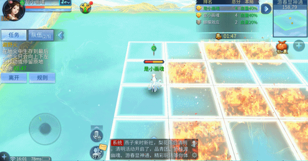 躲避燃烧的野火,才能成为笑到最后的主角!在玩法中,小伙伴们要观察地火的出现频率,当出现于自己脚下时尽快逃离。倒计时结束后按血量剩余排名,如果你足够幸运,说不定仅移动几步就可以成为第一名!