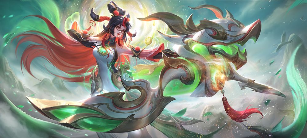 美术思路-以“龙形的吞脊兽”和“殿脊两端的卷尾龙头”的形象,结合当代国潮元素,整体风格倾向于成熟酷炫,颜色倾向于绚丽(红、黄、绿),体验皮肤时仿佛游走在灯火通明、充满国潮味道的街道一般。同时因鸱吻胆小的性格,整体形象上没有对其设计的过于夸张。