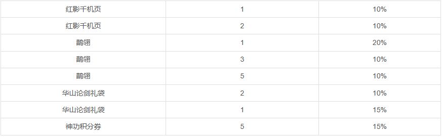 2、可抽取:红影千机页、鹊翎、华山论剑礼袋、神功积分券等超值大奖,100%中奖率!