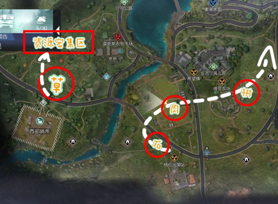 ②如果需要大量资源,建议去后两个采集点,强烈推荐奥罗水坝右边公路旁的矿石可随意采集,无丧尸干扰,嘎嘎舒服,如果需要石类和肉类两类资源的可以传送到格伦火车站,挖完矿往北走去农田打火鸡呦