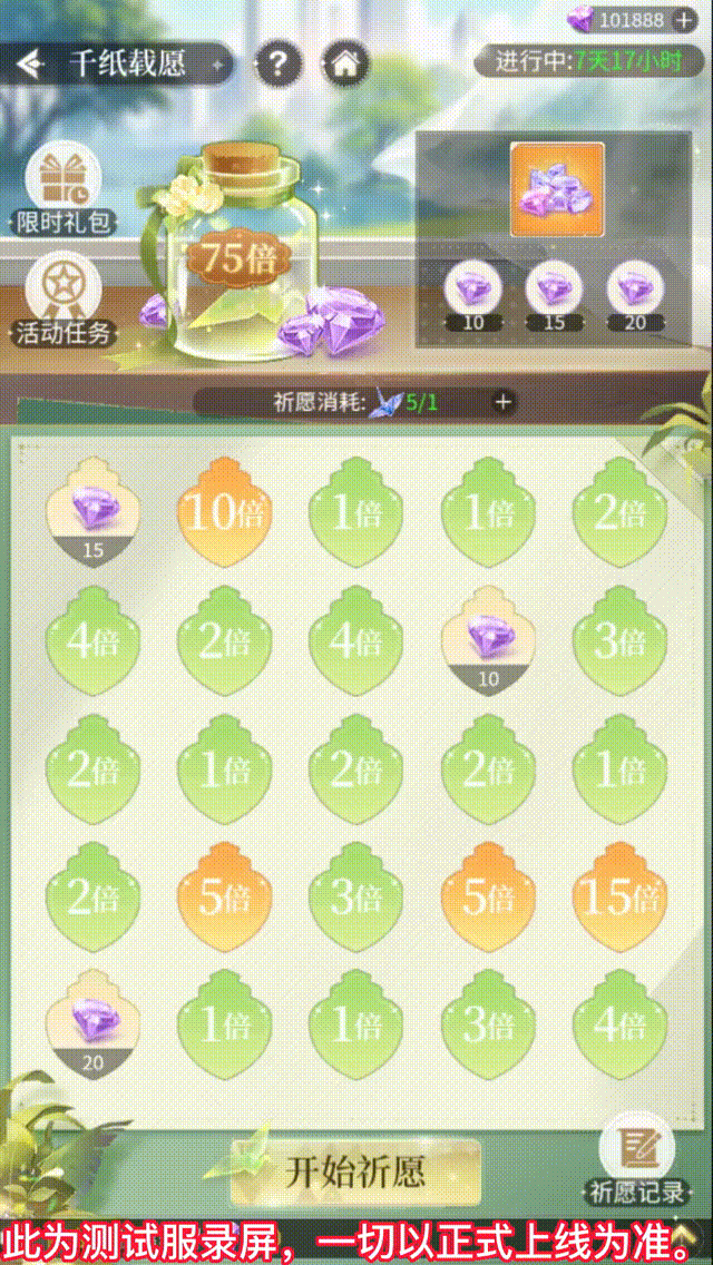每次祈愿需要消耗道具【千纸鹤】,若祈愿瓶内出现倍数奖励
