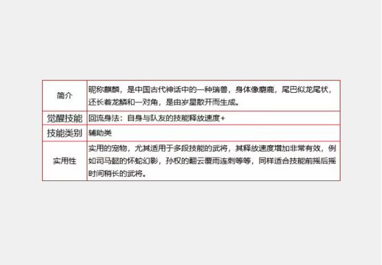 麒麟作为初期降世的橙色战宠,具备了独具特色的战宠属性、专属技能,其技能的等级也是其立足于世的基础。连同觉醒后解锁的专属技能位,麒麟有三个属性和三个技能,其中前三个为基础属性,分别为生命值、攻击力和防御力。而使用战宠内丹洗练后的技能可以看做是麒麟的神髓所在。一般而言,玩家努力提升其觉醒后的专属技能的等级固然重要,但提升麒麟的星级属性也非常重要,星级等级越高,为玩家主力阵容附加的战力也就随之提升。