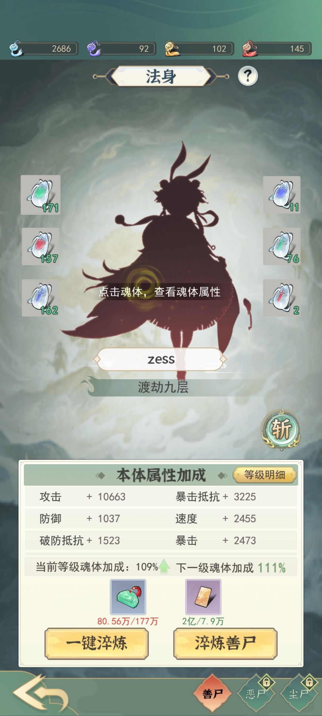 法身本体加成开始很低后面升级之后可以超过100%还是不少的。法身优先点速度>血量>攻击>其他