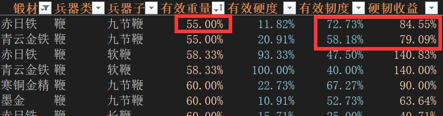 结合以上两图,在选择赤日铁的前提之下,选择九节鞭作为初始胚子,是满足伤害力、韧度、重量需求的最佳锻材选择。