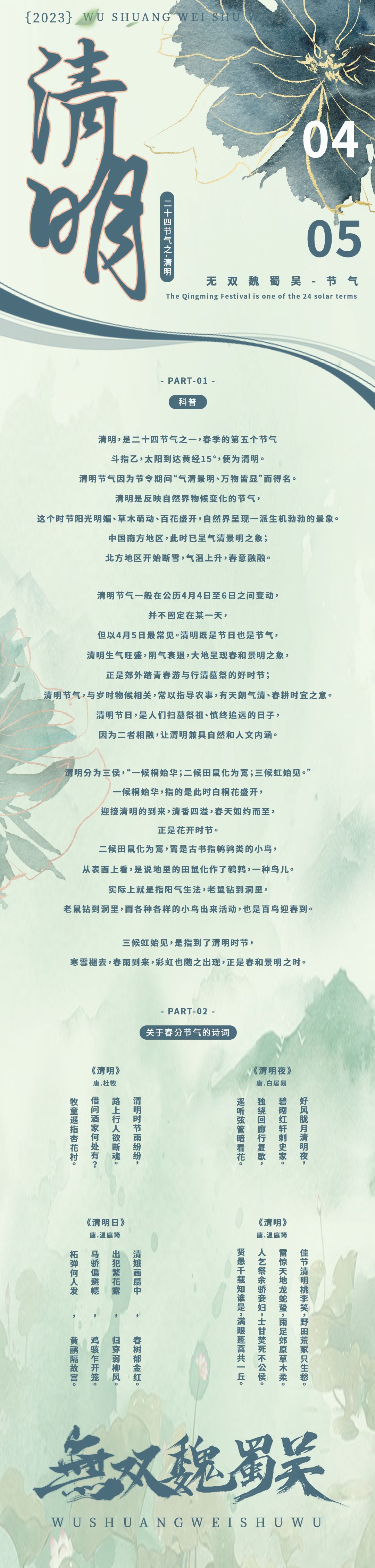 清明节气一般在公历4月4日至6日之间变动,并不固定在某一天,但以4月5日最常见。清明既是节日也是节气,清明生气旺盛,阴气衰退,大地呈现春和景明之象,正是郊外踏青春游与行清墓祭的好时节;清明节气,与岁时物候相关,常以指导农事,有天朗气清、春耕时宜之意。清明节日,是人们扫墓祭祖、慎终追远的日子,因为二者相融,让清明兼具自然和人文内涵。