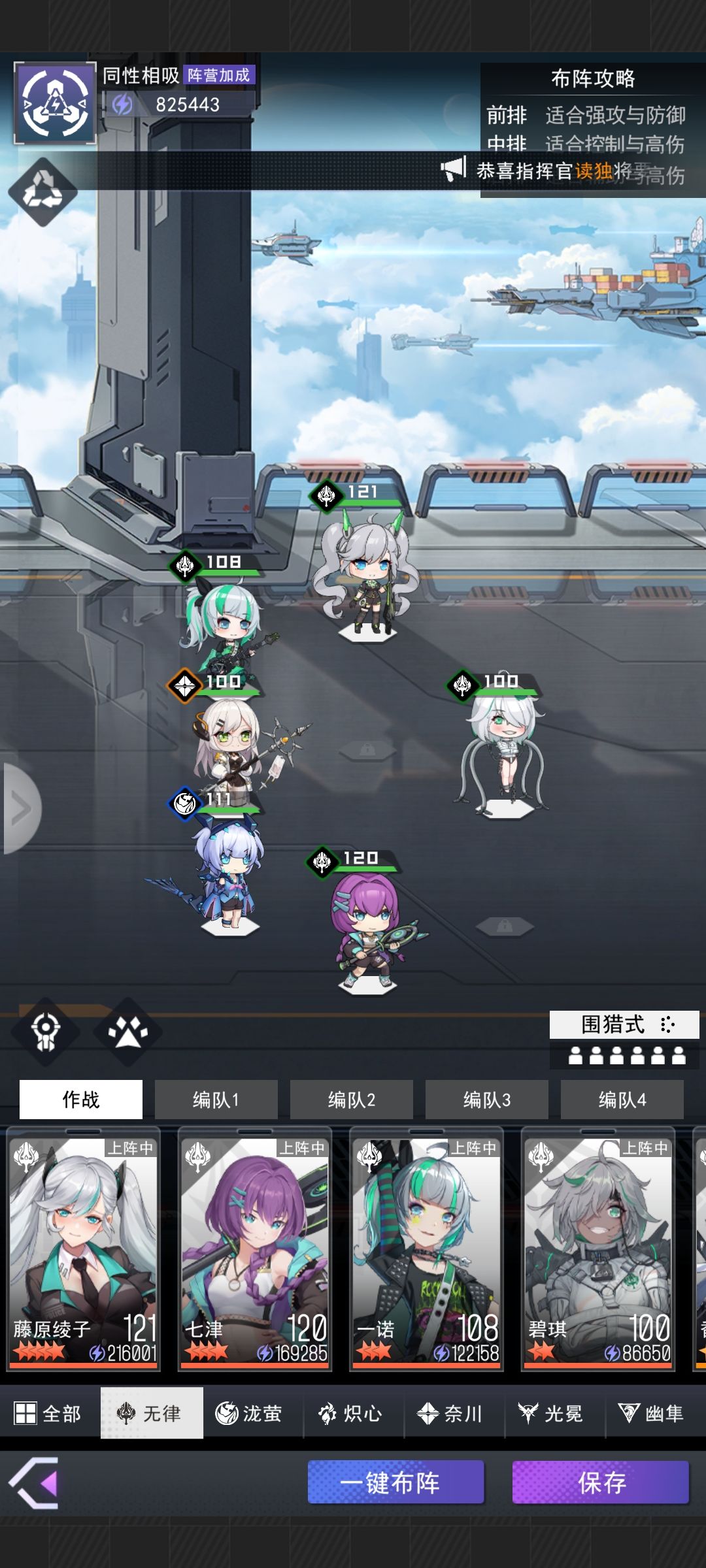 阵容我主打的无律队,也就是所有自选随机我都选的无律随机,一坦克三输出一辅助,美中不足的是许若媛没出几个升不了星,她是无律队的主要回复,所以现在用高星的四星辅助暂时代替,连续登陆七天可以获得一只许若媛本体,也就是明天,值得一提的是,即使明天是第一天登陆也可以直接领取七天的签到奖励。