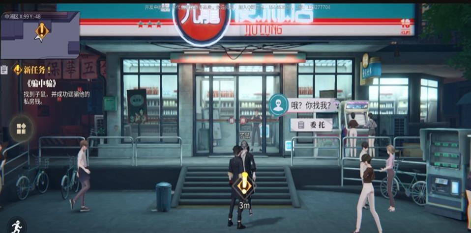 聊天后我们会传送到九龙便利店门口处,之后子鼠一直都会在这里后续还可以来这里找子鼠对话