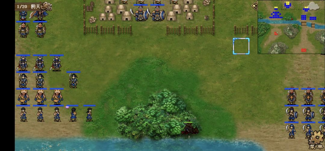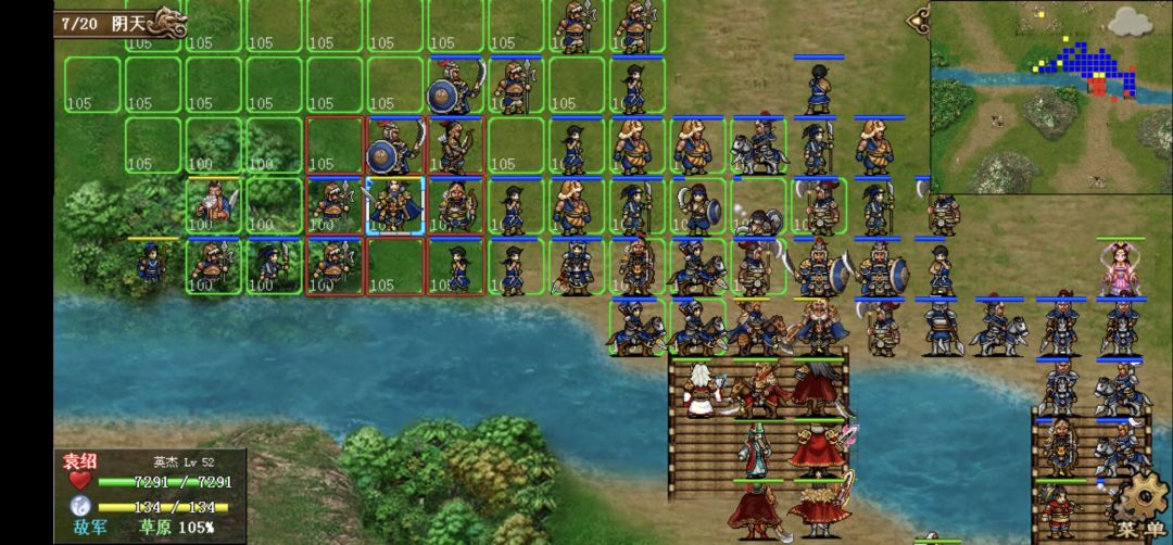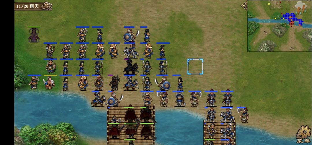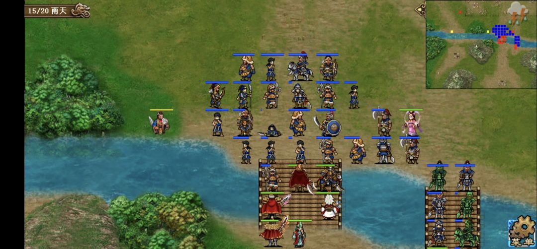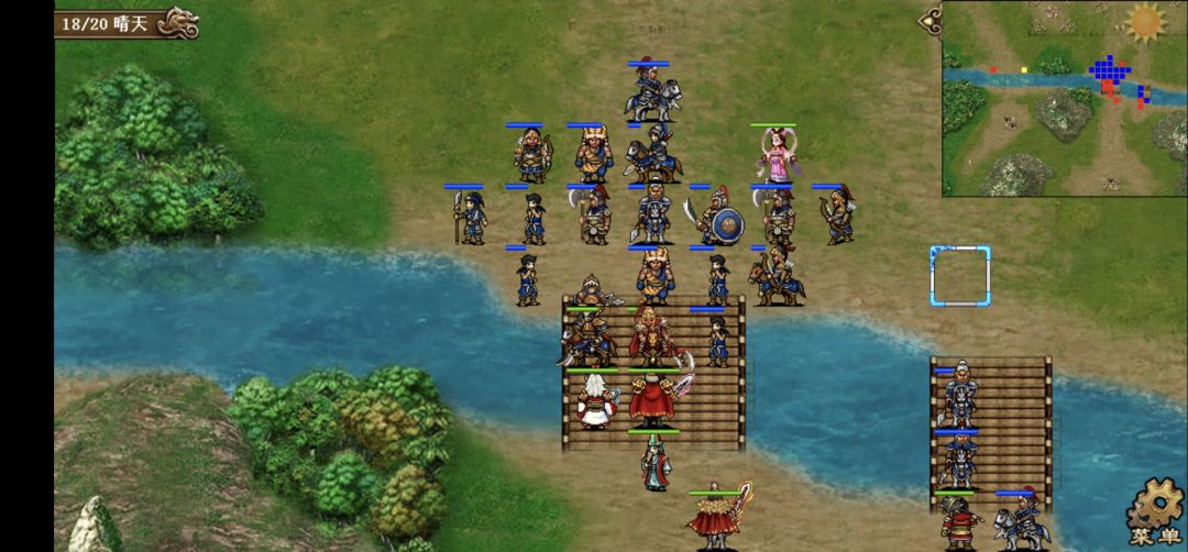 1、第一回合,本关借鉴白衣思路,右路回归强行,迅速向桥头前进,荀彧一发风龙吹桥头9人。左路全部双动,张合攻击后站位如下,吸引敌军向右并反击,其他三人向右移动和大部队汇合。
