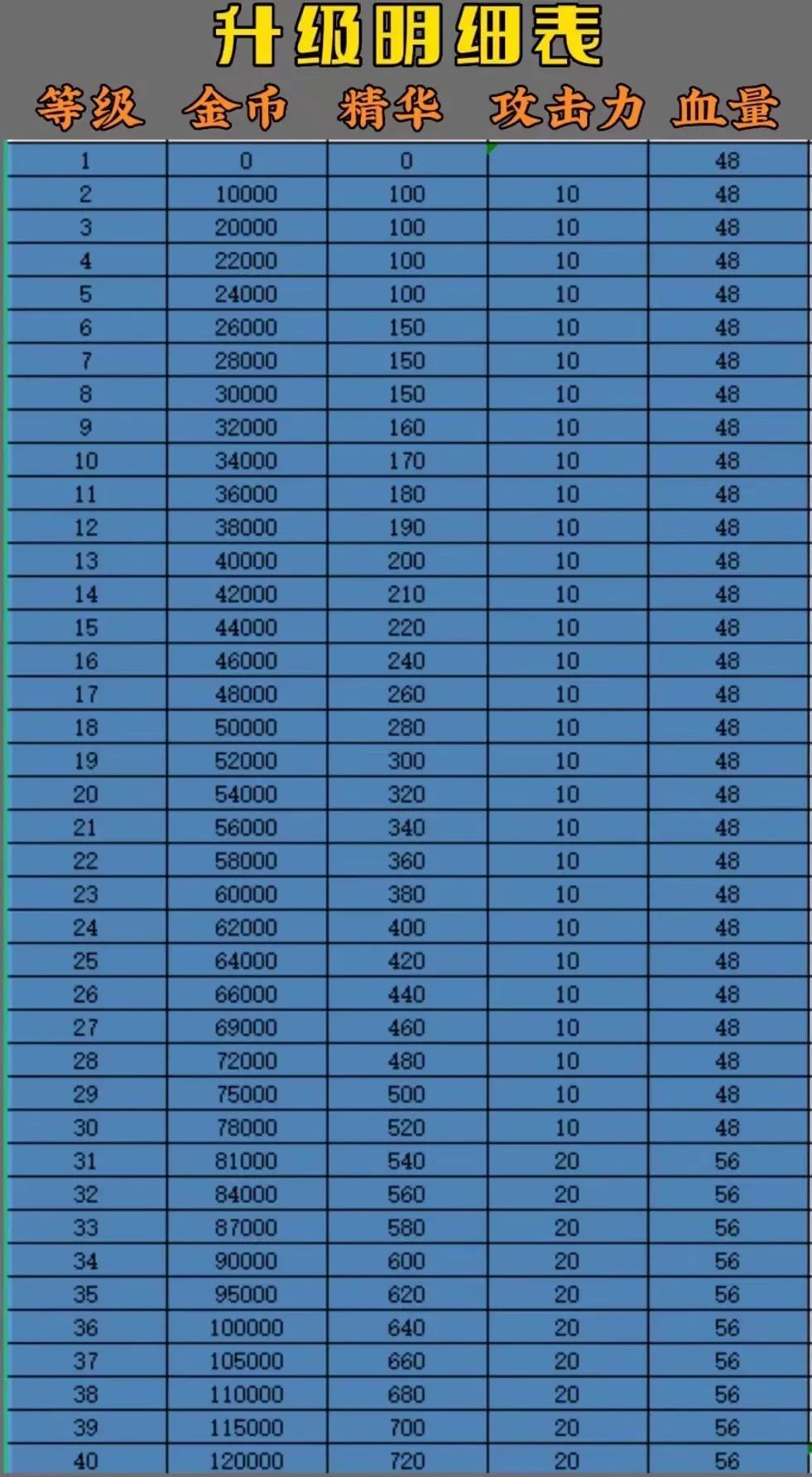 15-30级:每升一级所需精华比上一级多二十点,每升一级所带来的生命值和攻击力不变。总共所需五千九百二十点的精华。1-30级:总共所需八千二百点精华,能给我们带来两百九十点的攻击力和一千三百九十二点生命值。30-40级:每升一级所需要精华比上一级多二十点,能给我们带来二十点的攻击力以及五十六点的生命值。总共需要六千三百点的精华,能给我们带来两百点的攻击力和五百六十点的生命值。40-50级:每升一级所需要精华比上一级多二十点,能·给我们带来三十点的攻击力以及一百零四点生命值。总共需要八千三百点的精华,能给我们带来三百点的攻击力以及一千零四十点的生命值。最新兑换码:梨花风起正清明今天小编就给大家讲到这里了,感谢您的观看!小编每天给大家带来第一手的宝藏攻略和情报资讯,欢迎大家下面扫一扫加群和小编一起探讨游戏攻略和心得,我也给大家整理了最新的兑换码合集分享给大家,文章如有不喜勿喷,码字不易。