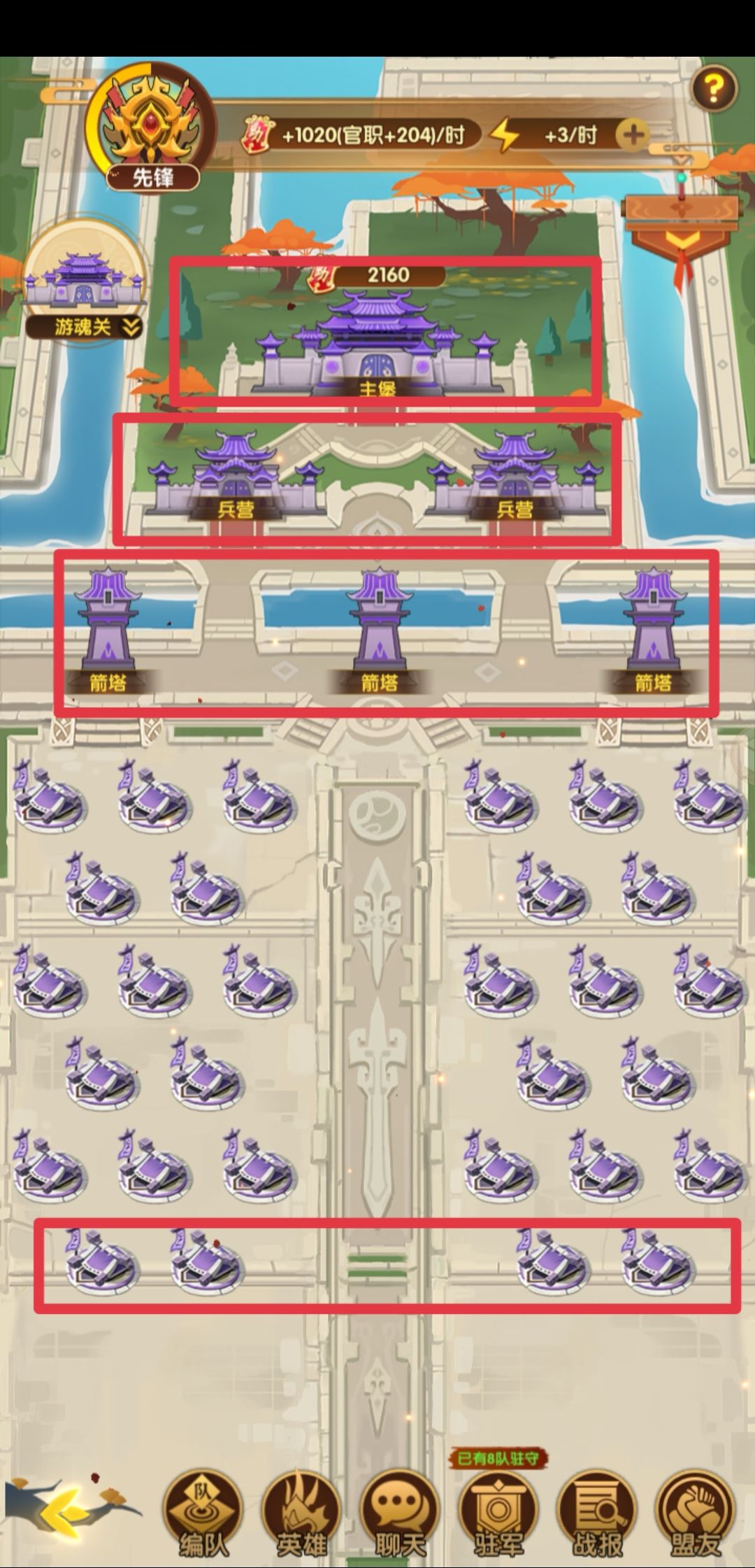 这就看服务器人数的多寡了,如果人数较多,完全可以把队伍放在第一行阵地驻守,因为进攻模式是由下往上的。当然,随着人数的递减,防守方式也随之收缩,这里就可以考虑队伍驻守在箭塔,因为占领箭塔,可以对敌方有更多的输出与加成。 然后就是兵营有战场技能,最后是主堡,关乎城池的归属,这里是重中之重,因为全服奖励是根据所归属的城池数来进行结算的,所以占领城池后,至少主堡都要放队伍。