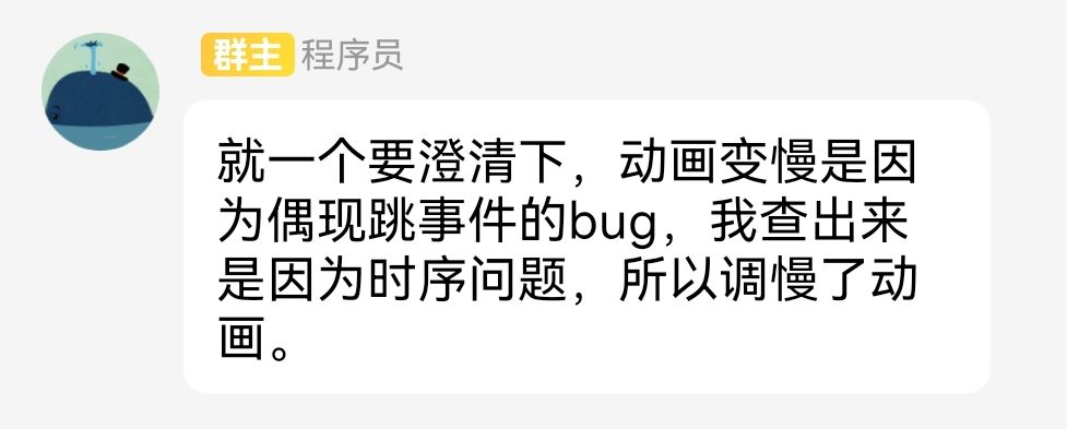 A:并没有降低全局速度,实际是在动画判定上多加了0.4s,从原来0.6s变为1s,因为动画播放过快会导致跳事件(很容易触发应该挺多人试过),有些人直接跳到结局了,所以调慢了速度(实际上新版本这个问题照样没解决,而且还有了新bug),官方表示该问题得有空重构代码才能解决,经过和官方沟通,决定调整为0.8s,目前正在打包。