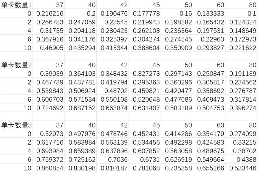 3. 在卡牌总数较为接近的比较中,卡牌上手率受小额过牌期望的影响比受卡牌总数的影响更大。比如37卡组单卡数量为3在过牌期望为0的时候上手率为0.53,45卡组单卡数量为3在过牌期望为2的时候上手率也为0.53。