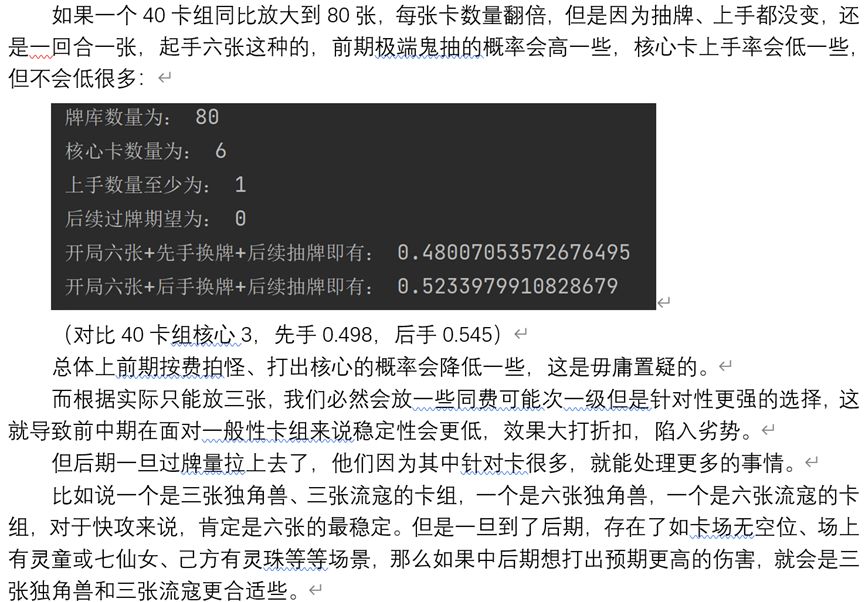 1. 越厚的卡组某张单卡上手率就越低,但随着单卡数量的增加和后续过牌变多,其与薄卡组的上手率差距会逐渐缩小(也很符合我们的直观感受吧?)。