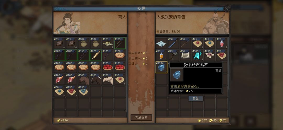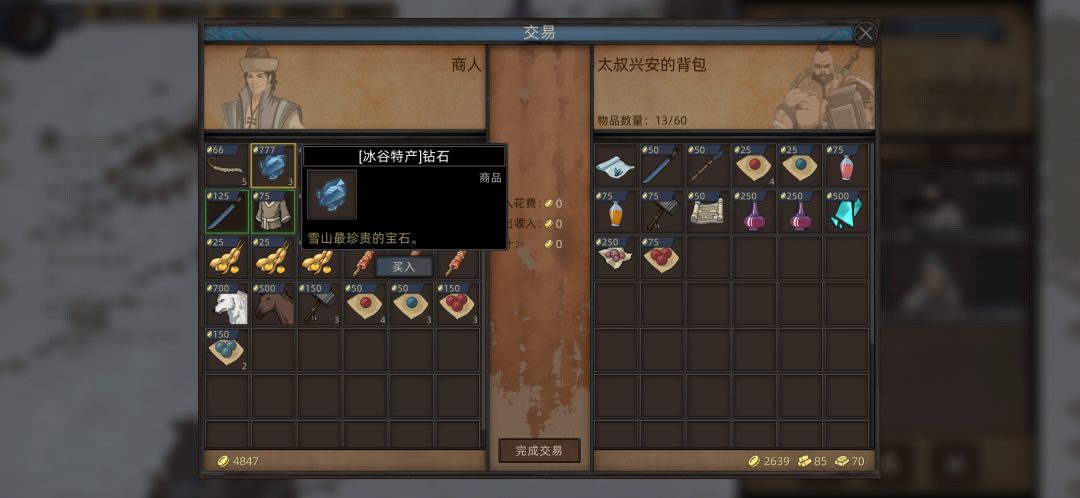 到冰谷,进城买东西,(买临时啥资格一百来乌塔),买入钻石卖出蔷薇秘药(狼皮也顺带买一下,我又忘了)要留一百乌塔购买临时通商!!!