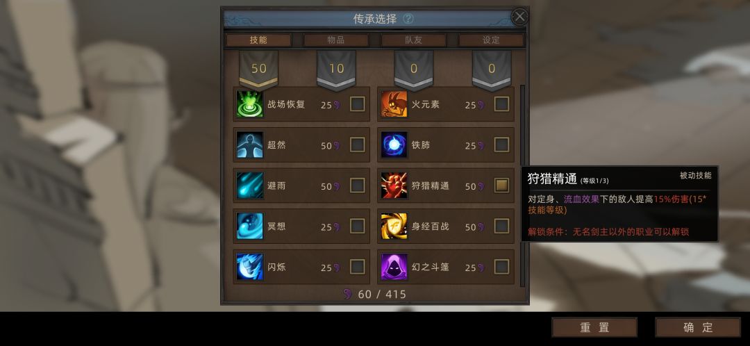 开局60传承点(要是速通主线就带着,要往后拖到500天后的话,狩猎精通换成遁入阴影+雾遁)遁入阴影升3,雾遁升1就行