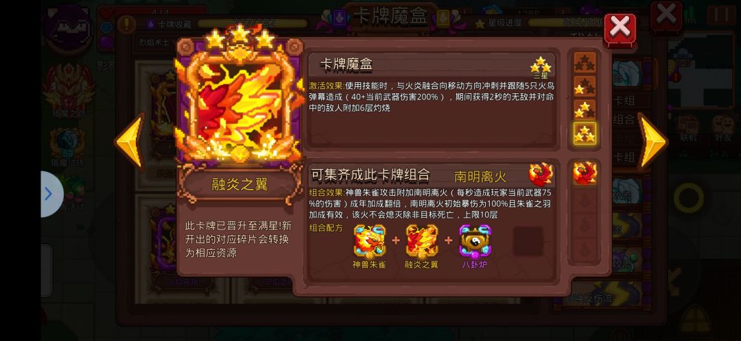 5只鸟+2个地火+杜内闪击+杜内天赋100%暴击=高倍率多段伤害,拿个高攻击力锤子一个技能就能打死boss(我卡组全满星,不知道你们打不打的死)即使不死也临近濒危了,若碰到免疫元素伤害的帝国boss休斯泽,请先打爆周围对应的元素球