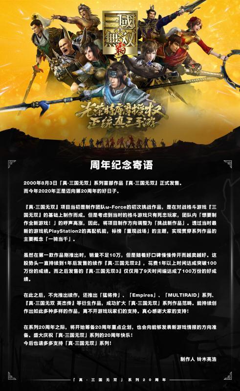 《真·三国无双》系列二十周年纪念日将至!制作人寄语全球玩家
