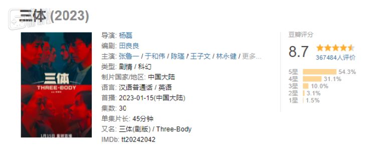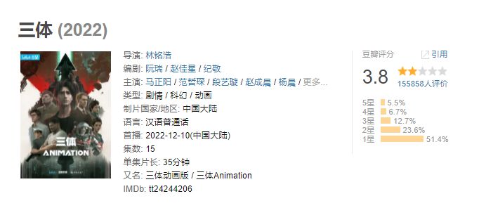 与其对比明显的电视剧版《三体》,如果说剧版初期的口碑还是被动画衬托出来的,那么大结局时的高评分已经和动画表现毫无关系了。