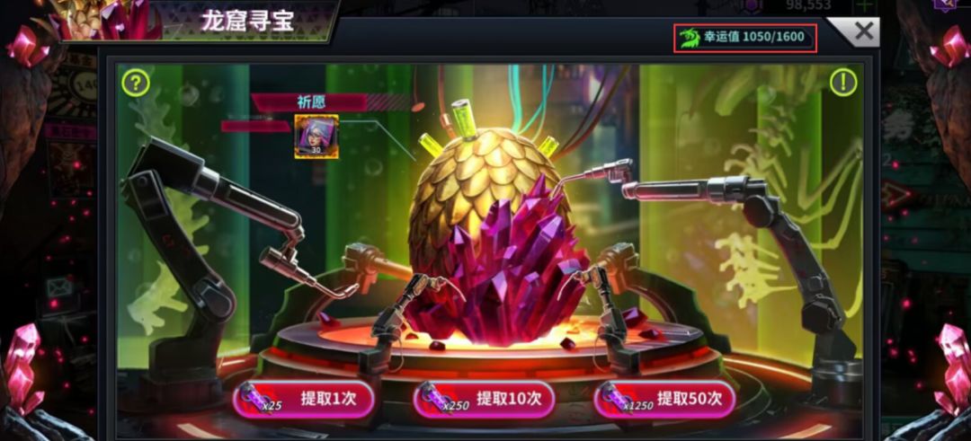 2.玩家可以祈愿自己想要的目标奖励,每次提取时未获得目标奖励就会积累幸运值,幸运值满后必定获得祈愿物品,每祈愿1次获得10幸运值