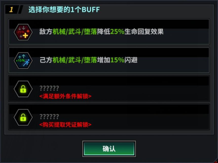 5.普通试炼每次通过后可获得BUFF选择,普通通过为2选1,满足额外阵营条件通过则额外多一个可选择项,购买了基因提取凭证可再额外多一个可选择项,BUFF本轮试炼均有效果,选择后无法更改