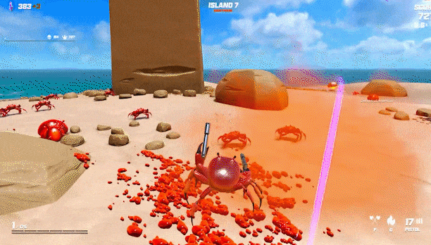 说回游戏本身,作为一个整活向的游戏,同时也是Noisestorm的处女作,这款游戏只能用简陋来形容,甚至连新手引导也没有。但对于有游戏经验的玩家来说,《螃蟹争霸赛》的玩法很好理解——肉鸽类型,节奏极快,靠收集战利品来强化自己,与《雨中冒险2》颇为相似。不少人体验过后表示“爽得一批”。