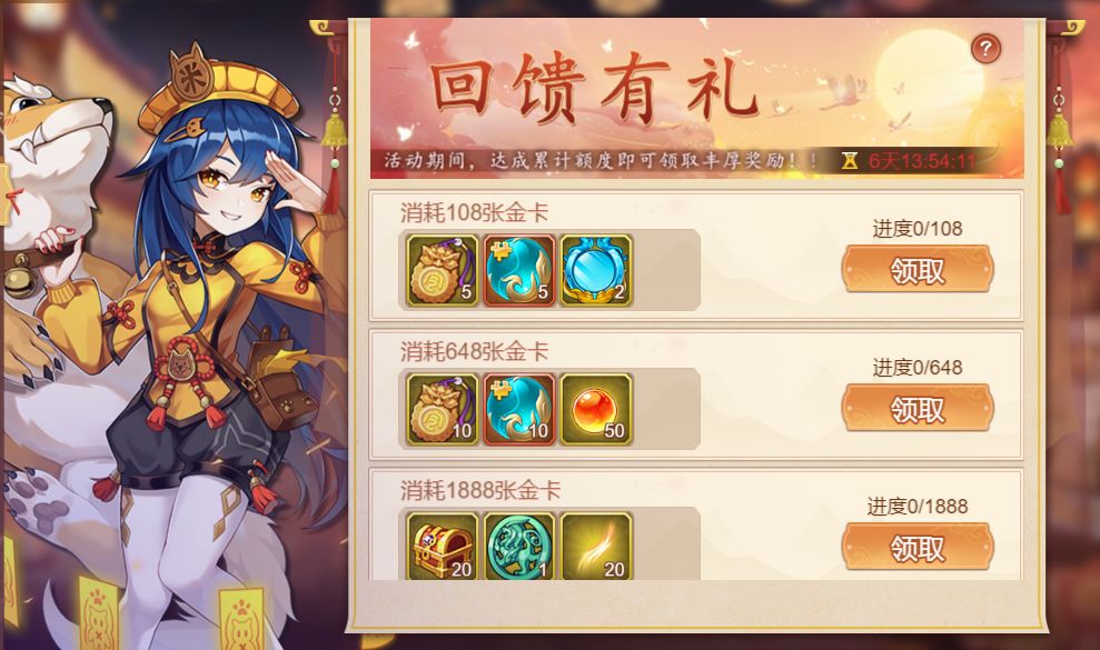活动内容:活动期间累计消耗金卡达到指定的数量可以领取奖励。