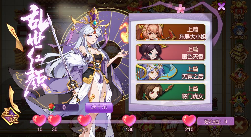 活动内容:活动期间,完成乱世红颜剧情副本挑战收集玫瑰花,赠送玫瑰花获取爱心值领取奖励。(活动结束时未使用的道具“玫瑰花”将会被过期清除)