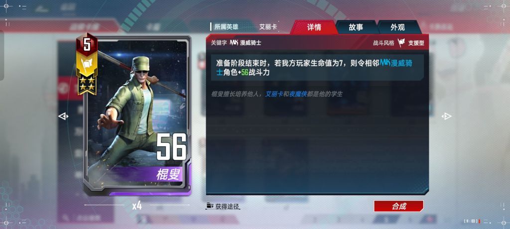 在这里介绍一套控7棍叟蜘蛛刀,对比传统蜘蛛飞刀,增加了棍叟这卡,在控7血的时候,可以持续给左右的漫威骑士角色涨身材。4星棍叟在7血时,一回合就给左右各加56点战斗力,大身材提高存活率。