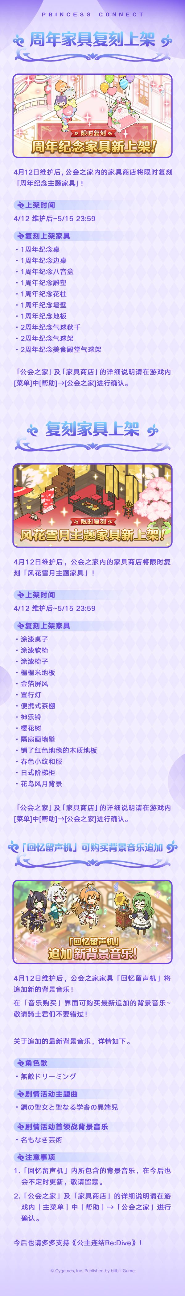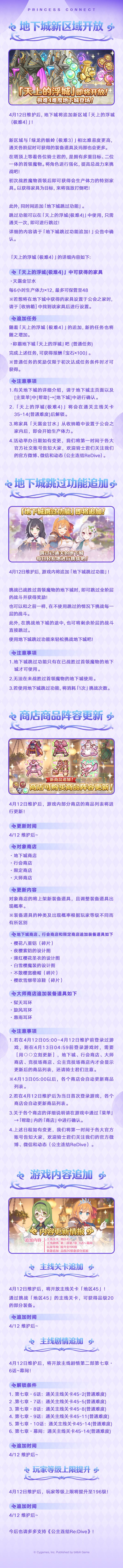 4月12日维护结束后,公会之家将限时复刻周年纪念主题家具、「风花雪月」主题家具;回忆留声机将追加新的背景音乐;同时,地下城将追加新区域,追加地下城跳过功能;大师商店将上架新的商品道具,并追加新的游戏内容!
