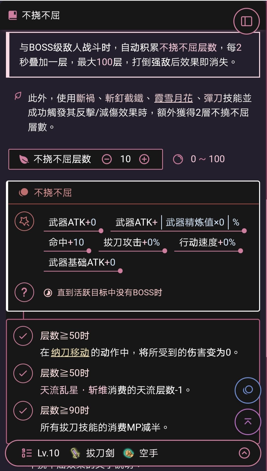 嗯,用【斩钉截铁】叠层的劣势是蓝耗太高,且有物理惯性,还不能免疫非限制性负面。用【弹刀】叠层的劣势是抗不了致死性攻击,以及和【斩钉截铁】一样有物理惯性且不能免疫非限制性负面,甚至还不能和【斩钉截铁】一样免疫附带「逼退」效果的攻击。用【霞雪月花】叠层更不必说了,实用性还不如前两个,直接淘汰它。对此,我的建议是刷一个『断祸·除魔』的托环(有这个托环后,【断祸】可以减轻90%物理和百分比伤害,75%魔法伤害),然后战斗时不停地裸放10级【断祸】去碰瓷,这样只需要花费100蓝就可以快速地无惯性叠【不屈不挠】了。是的,我早就把『断祸·除魔』这个托环安排好了,哈哈哈哈!