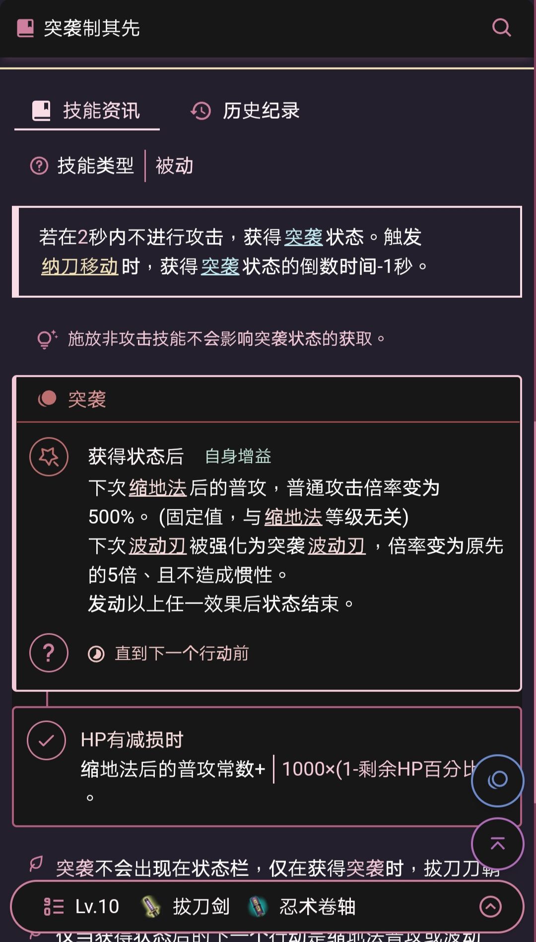 之前【突袭制其先】要等3秒才能发动,加强后就不用等3秒了,而是等2秒,而且你纳刀滑步一次就可以减少1秒,最重要的是裸放【波动刃】这个技能本身也可以触发纳刀,这就是说,你基本上完全可以一直不停地施放仅需100蓝但高达15倍率的【突袭波动刃】!【波动刃】是享受拔刀伤害和距离伤害的,这和100蓝的【天流乱星】一样,但【天流乱星】要热刀,它却不用!并且由于【波动刃】可以远距离施放(会略微降低该技能的物理贯穿,但是几乎是没有影响),纳刀滑步时还能获得无敌状态(【不屈不挠】50层后),战斗时比【天流乱星】安全太多太多!更重要的是,【突袭波动刃】不造成惯性!原本每次用【天流乱星】还要平砍一次平衡惯性!但你用【突袭波动刃】的话,你只要前期叠好伤后,后期你都不用近身普攻叠惯性,你可以一直远远地放【突袭波动刃】,你说普攻回蓝?你可以用忍术【空蝉】回蓝啊!所以,【突袭制其先】这个技能以后必须学!