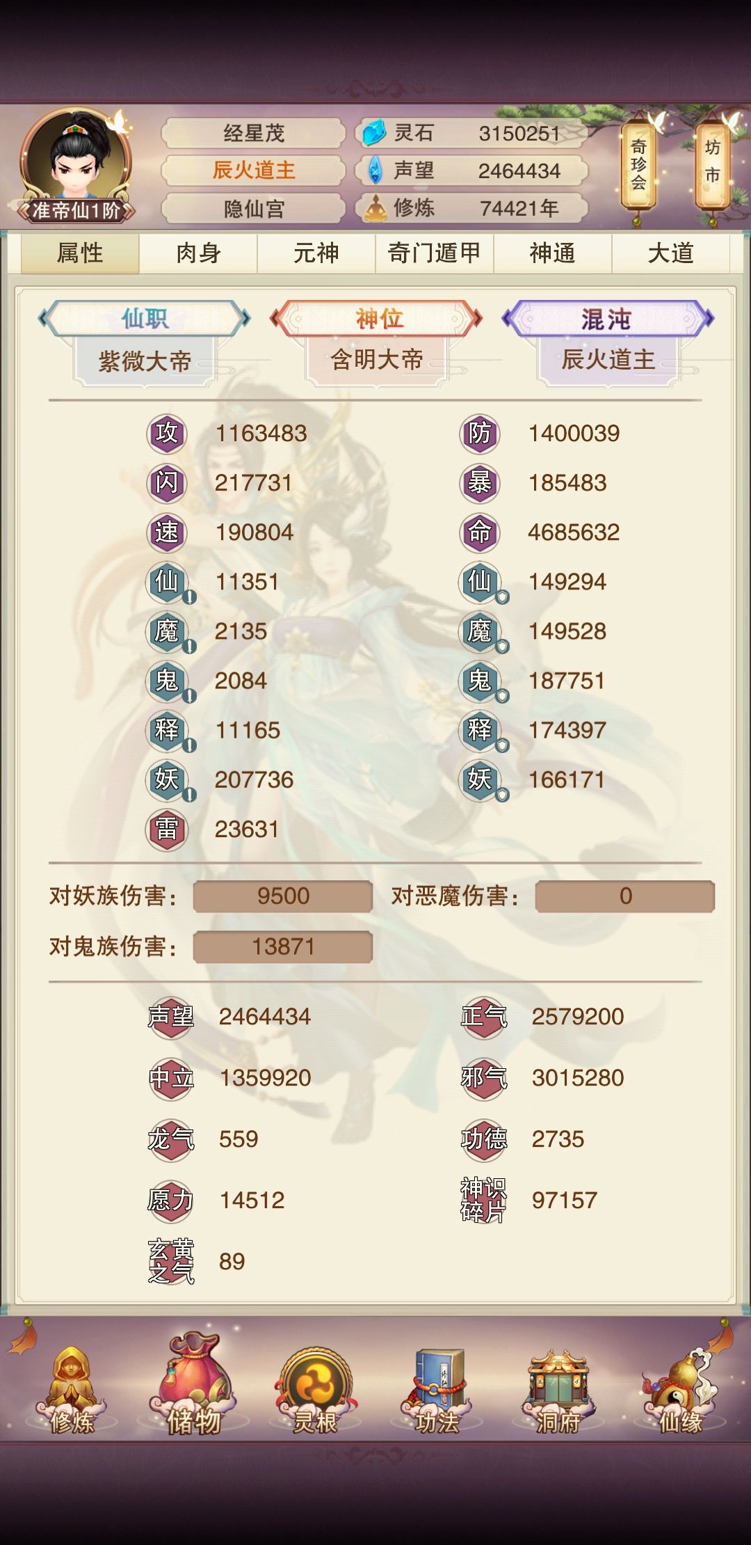现在修为122w一跳。二星道主马上拿下,之前接车被跳车了导致玄黄紧缺。吐槽一下门派概率,高级龙元都买好了,2000w的声望却没刷到剩下3个新门派其中一个。属性如下,等过个十几天第二个灵台基本上搞完,又能加几万攻防。