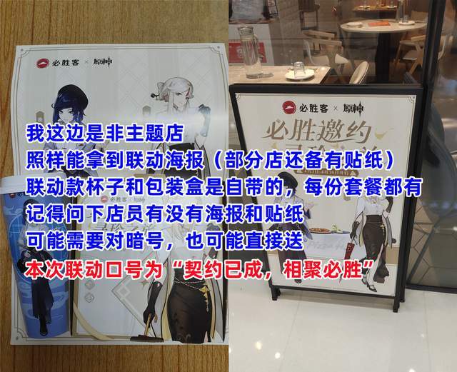 这次联动准备明显比之前更充分,所以无论是以往出现的物料短缺还是线下排队的问题,大家基本都不用担心再次发生。到店以后,如果遇到不懂的问题,尽管大方地问店员即可,包括怎么使用预约好的套餐,以及点餐后获得的兑换码,店员一般都会耐心地给你解答。门店分主题店和非主题店,区分方法是主题店会布置各种角色墙纸,店员换上带有“璃月”或“必胜”字样的服装,以及会有专门用来玩小游戏的区域“必胜戏台”。另外根据官方介绍主题店还有联动海报和贴纸,事实上非主题店也有机会拿到,像我这里的非主题门店就有联动海报。大家记得开口问问店员有没有海报和贴纸,顶多需要我们说出本次联动的口号“契约已成,相聚必胜”就能拿到,万一说错了一两个字或者忘记口号店员也会提醒;有的门店甚至会直接送。