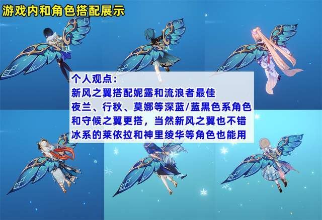 拿到兑换码并在游戏内兑换后,接下来自然是给自己心爱的角色换上新风之翼。本次联动风之翼主色调为蓝色,蓝的程度比守候之翼要浅,所以个人认为像夜兰、莫娜、行秋这类服饰偏深蓝或者蓝黑色的角色,搭配原有的守候之翼,外观一致感会更强;而新风之翼看上去和妮露、流浪者更搭一些,和冰系的神里绫华和莱依拉搭配也有不错的效果。当然以上仅为个人观点仅供参考,大家也不一定追求绝对的外观适配,原来的风之翼用腻了同样可以使用新风之翼换换口味。