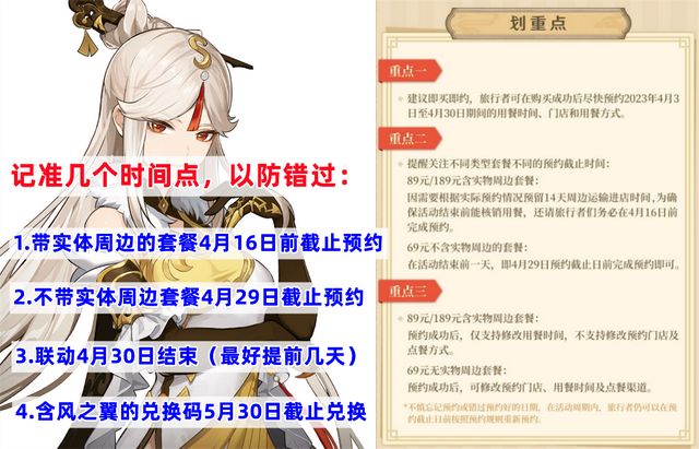 联动正式开启的时间是不久前的4月3日,如果是之前就已经预约成功的小伙伴,直接在对应的时间点,根据你之前预约的方式到店或者选择外带/外送服务即可。如果是还没预约但想要参加,又或者已经预约但还没参加的小伙伴就要记住以下几个时间点了:1.包含实物周边的套餐(89/189档)需要在4月16日前预约,无论是第一次还是修改都要在这个时间点前预约(注意是预约不是使用,使用在4月30日前就行),因为店家要提前准备物料;2.如果错过了上述时间点,16日以后预约就只有普通(69档)套餐了,且需要在29日前预约,不过同样有风之翼奖励;3.联动结束时间为4月30日,不过个人建议不要等到临近结束再预约,最好提前几天;4.风之翼兑换码兑换截止时间为5月30日。