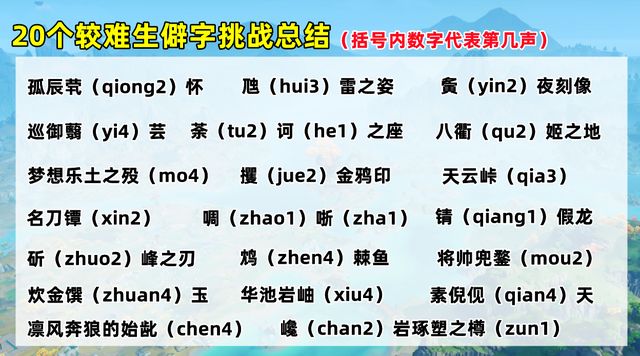能拿到奖励,并且还能感受联动氛围的小游戏这次总共有两种。一种是你演我猜,需要无声表演原神的某个角色或角色技能让另一位小伙伴猜,不过整体难度不大。相比之下另一种生僻字挑战会更难一些,题库有上百题,但大家也不用全部掌握,只用答对一定数量就能拿到奖励,店员还可能会故意“放水”让难度再降低一些。所以我给大家汇总了个人认为题库里最难的20种生僻字(如图),掌握这些就基本够用了。