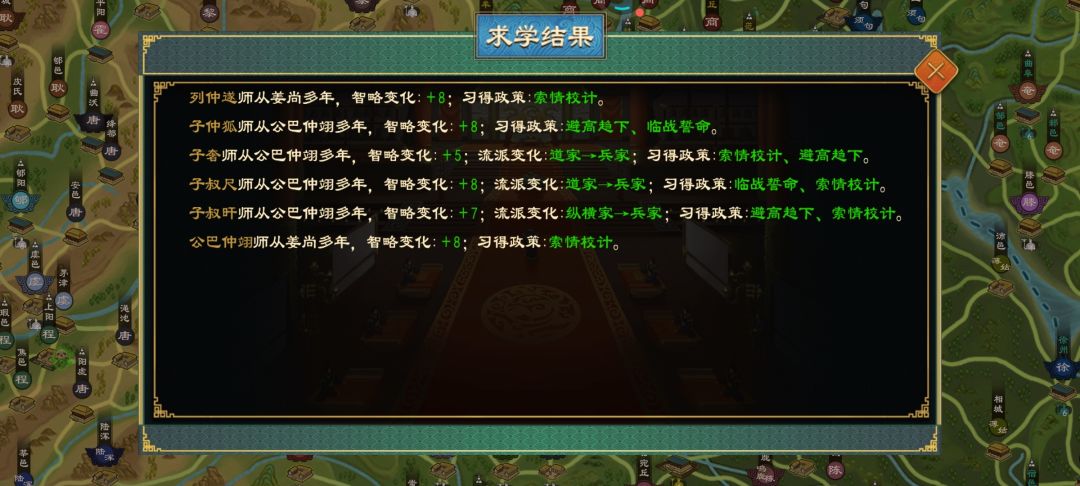 求学判定成功就会获得智略,求学判定失败的情况下就不会获得智略。在判断求学成功的情况下才会再次判断是否习得政策,习得政策的成功率和学子自身的智略有关,智略越高概率越高,在政策学满的情况下才有可能会习得能力。