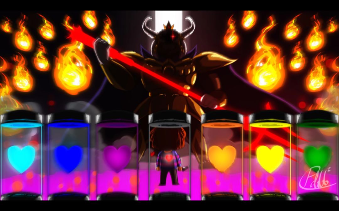 这时,小羊吸收了六个人类灵魂再加上地下所有怪物的怪物灵魂,正好组成了七个人类灵魂的力量,成为了神,攻击和防御通通都是无限,是传说之下这款游戏中当之无愧的最强角色。