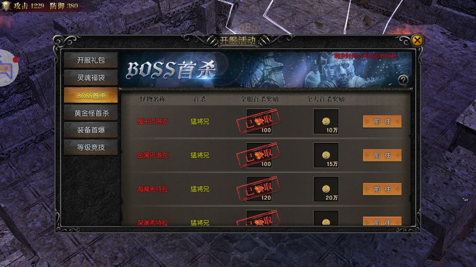 开服第1天开启BOSS首杀活动,持续7天。活动期间,全服首次击杀指定BOSS的玩家