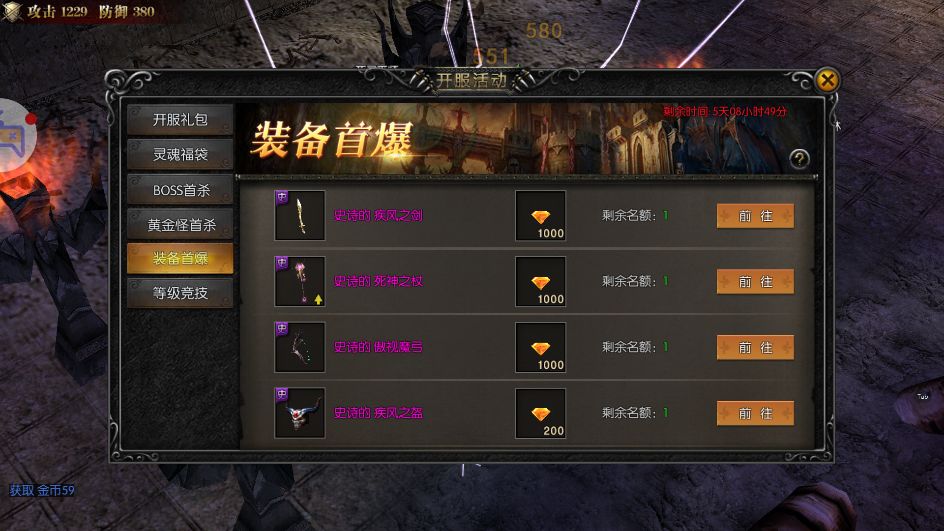 1、开服第1天开启装备首爆活动,持续7天。活动期间,玩家成功击杀怪物首次拾取指定装备即可获得对应的丰厚奖励。全服指定装备首爆奖励领取次数有限,先到先得,不要错过!