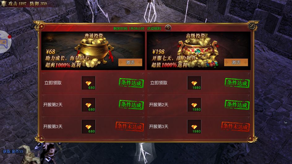 开服第1天开启开服投资活动,持续3天。活动结束前激活,开服前7天每天解锁一档奖励,激活后直到领完所有奖励入口才会消失。购买任意投资计入充值活动。