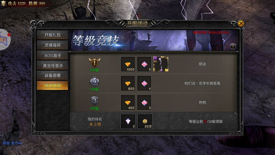 开服第1天开启等级亮技活动,持续3天。活动期间,根据玩家角色等级来排名,若角色等级相同,按照达到等级的先后顺序排序。排名前10的玩家将获得排行榜奖励,奖励将在活动结束后发放至邮件。玩家达到指定等级也可获得对应等级目标奖励。