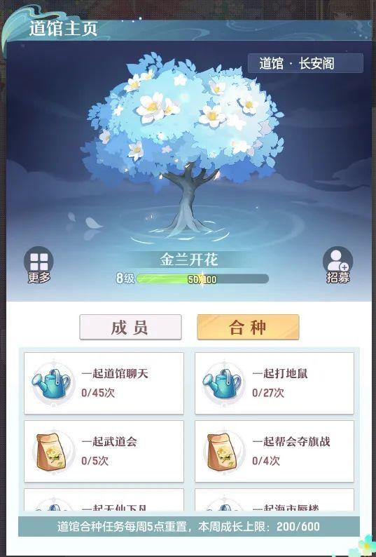 3、成功组建金兰道馆后,将开启专属聊天频道并解锁象征友情的金兰之木,完成道馆合种任务可培养金兰之木,随着金兰之木等级的提升,将逐步解锁更多成员位置、道馆技能等。