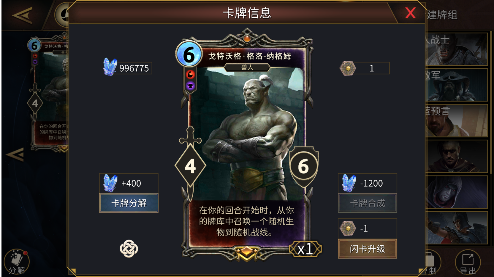 添加其他核心套牌和黑暗兄弟会的兽人卡牌来替换近似费用的卡牌,如橙卡戈特沃格·格洛-纳格姆(对兽人提升巨大)和加格纳(黑暗信徒)。