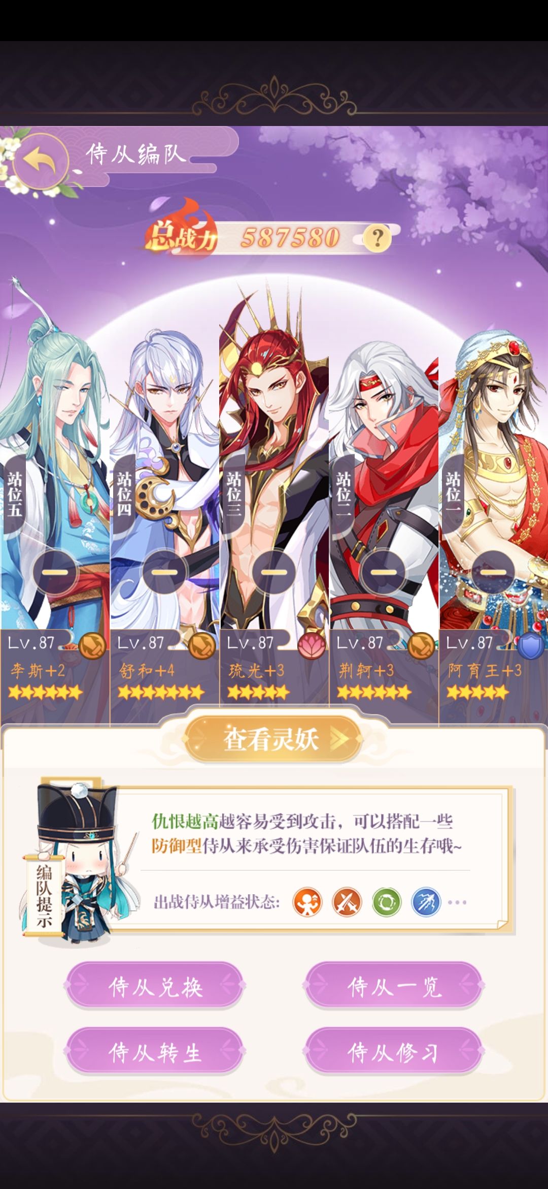 我现在阵容:李斯6星信物满星,月亮满星信物4星,天竺5星信物3星,太阳5星信物1星,荆轲6星信物2星