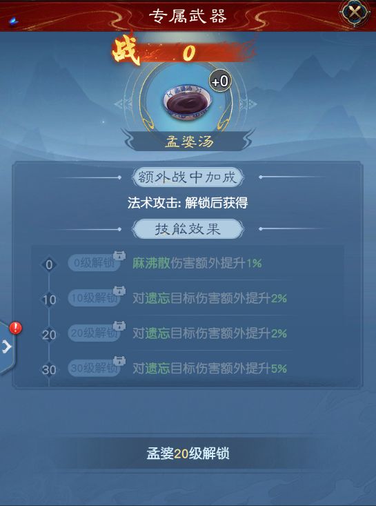 此外,等级增加到20级后,解锁专属武器孟婆汤,可以进一步加强她的麻沸散技能效果。